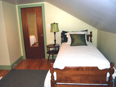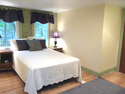 The green room has a double bed and a twin bed. Each bed has a comforter in case of cool nights. The flooring is hardwood with an area rug.